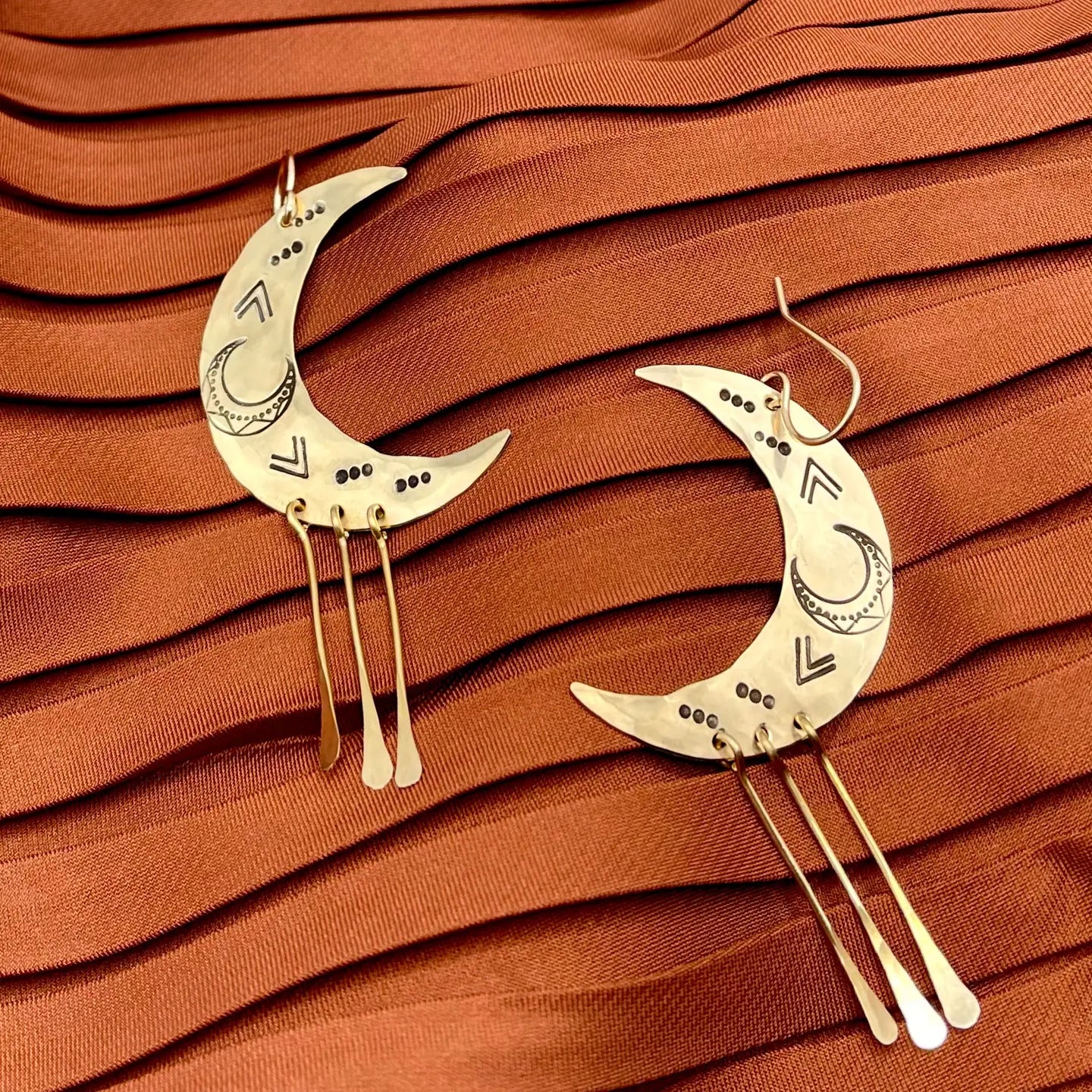 Hand stamped gold or silver crescent moon pendant that hangs from 14 karat gold filled or sterling silver ear wire. Approximate Measurements: 30 mm wide 80 mm long ----- Ear wires and necklace chains are hypoallergenic and are sterling silver or 14 karat gold filled. Gold and silver pendant pieces are made of raw brass or sterling silver plated brass and can be polished the same as all other precious metals.