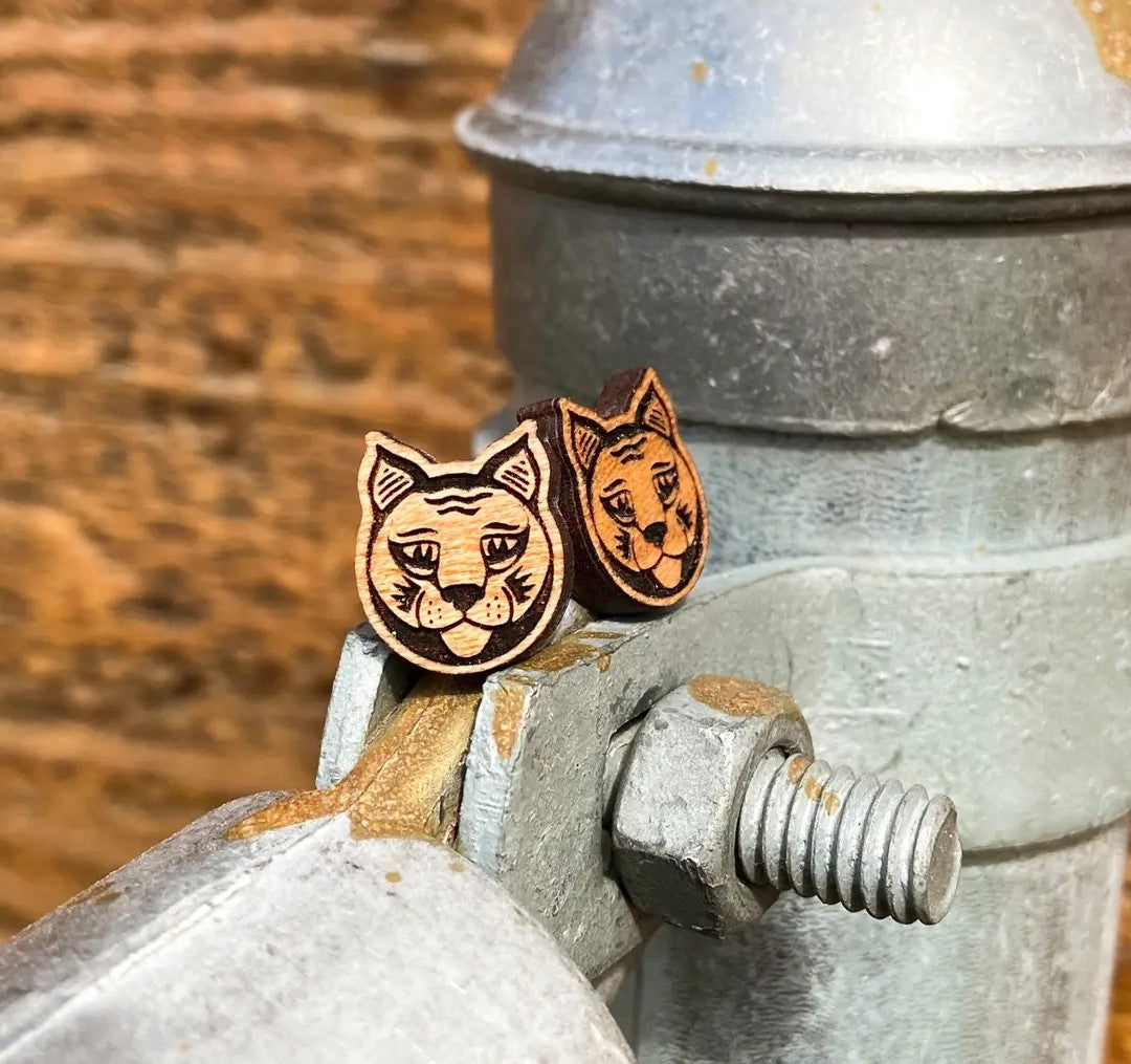 These cool mountain stud earrings are made out of cherry wood, metal is sterling silver.