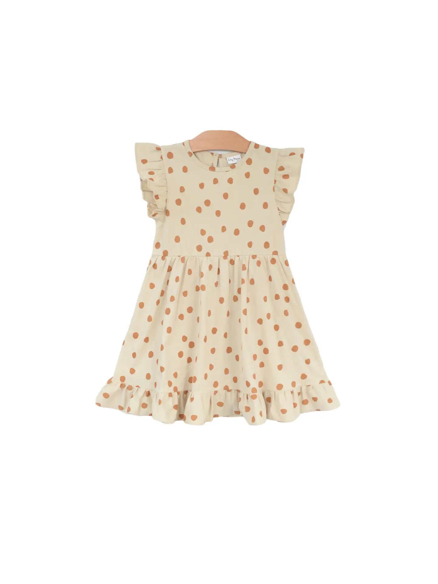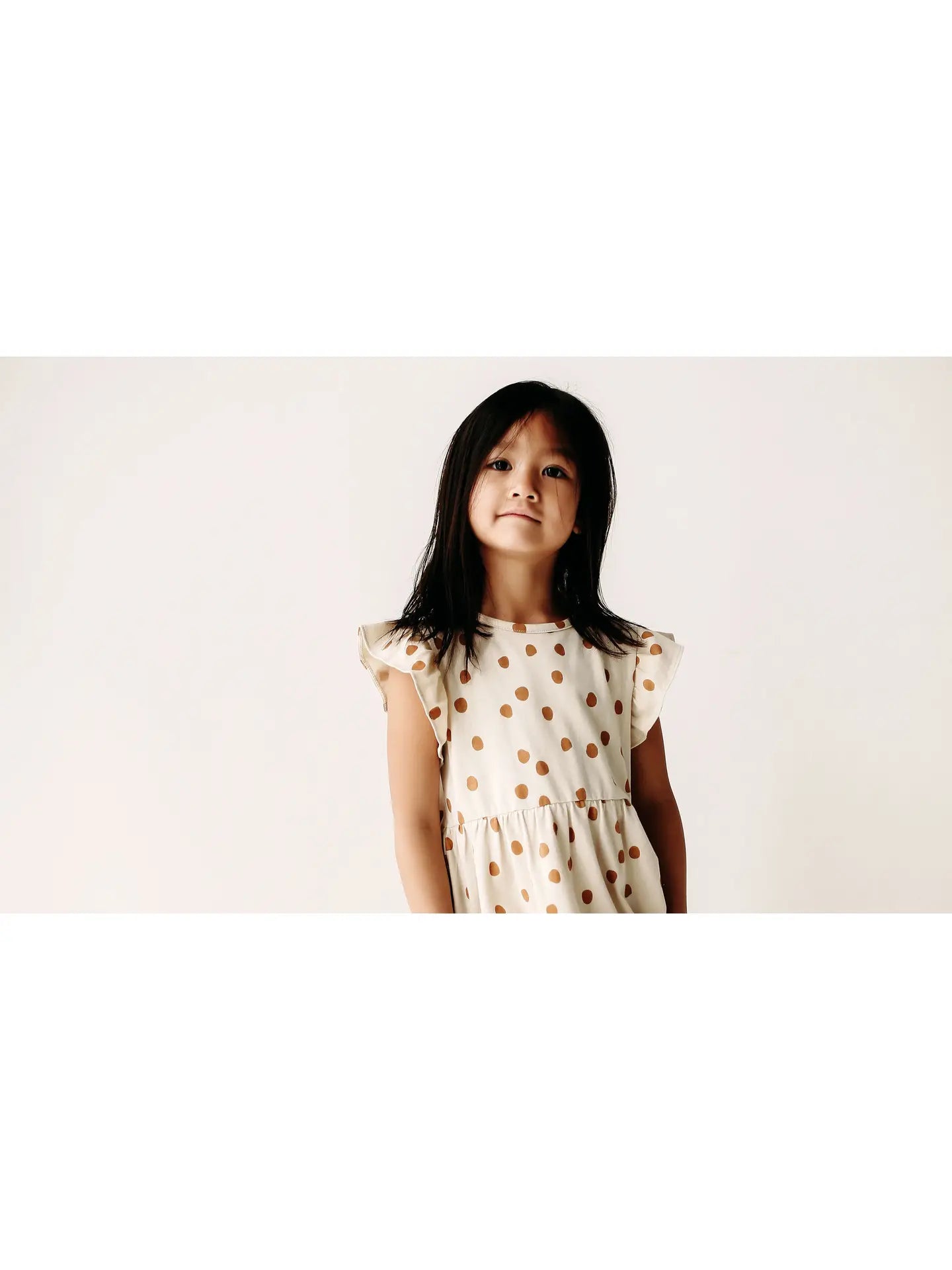Our ruffle dress is made from 100% combed cotton jersey and printed in our fun saffron dots print that is perfect for Spring excursions.