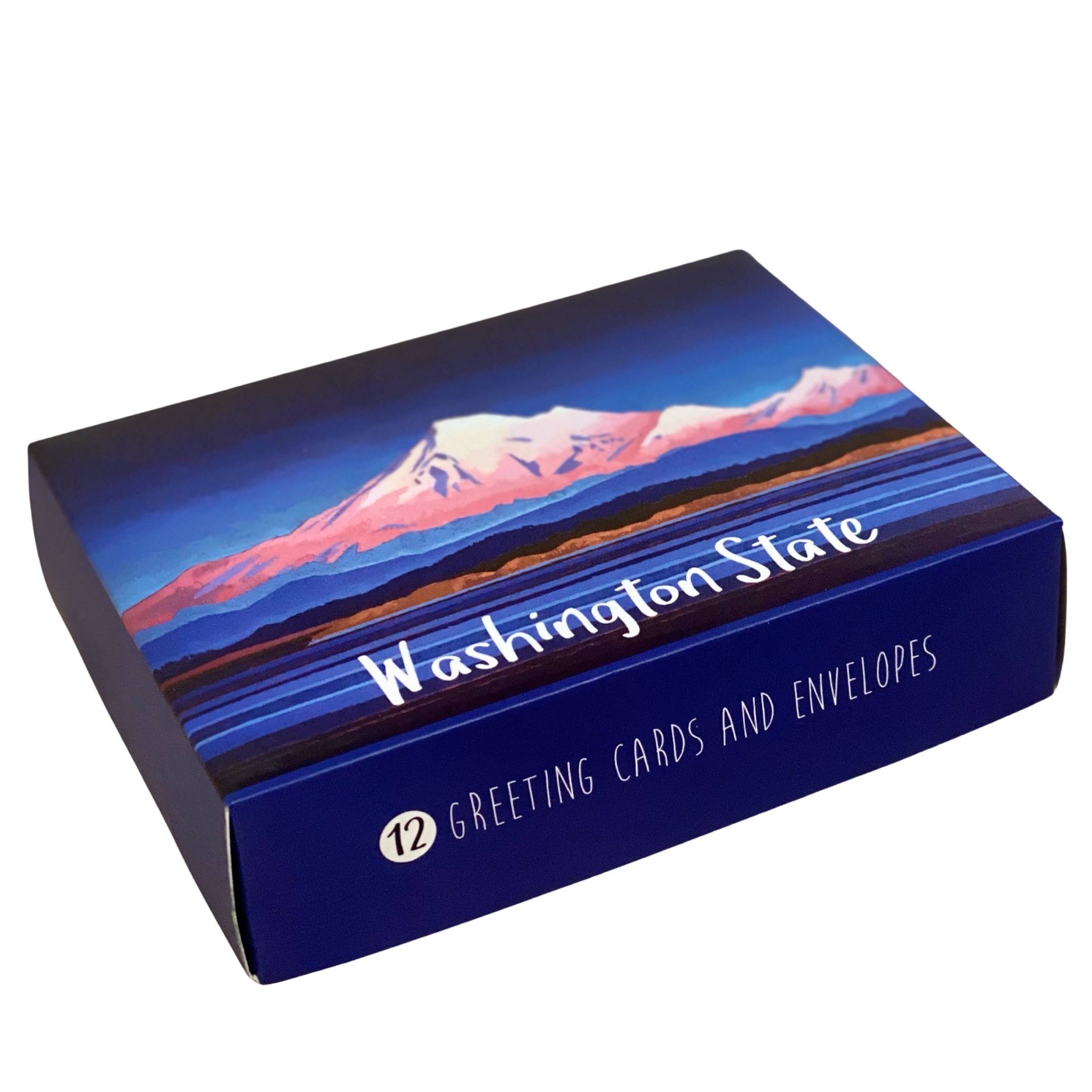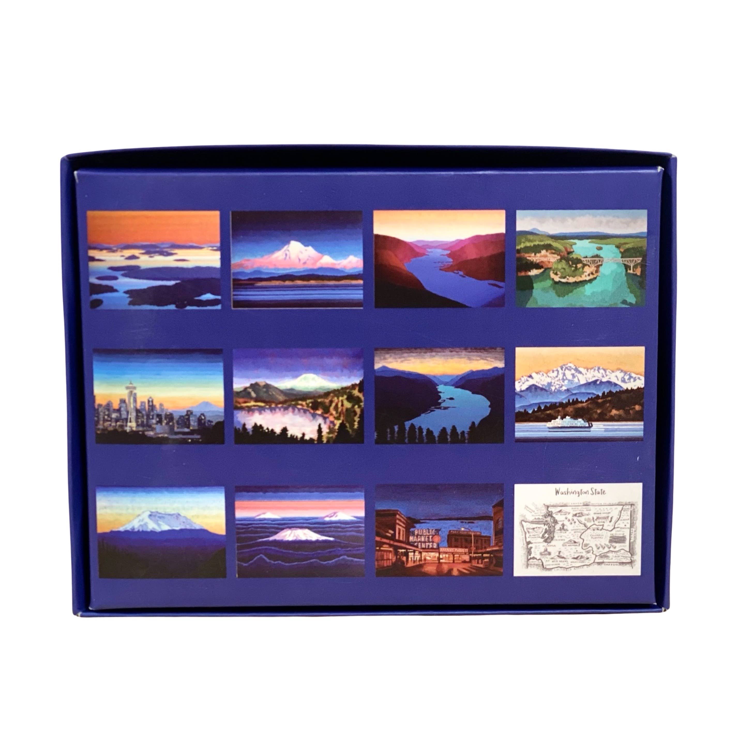 4.5" x 6" x 2" boxed notecards featuring 12 breathtaking images of Washington. Including: San Juan Islands, Mt Baker, White Salmon, Deception Pass Bridge, Seattle Space Needle, Eunice Lake, Columbia River Gorge, Olympic Mountain Ferry, Mt St Helens, Three Beautiful Mountains, Pike Place Market, Map of Washington.